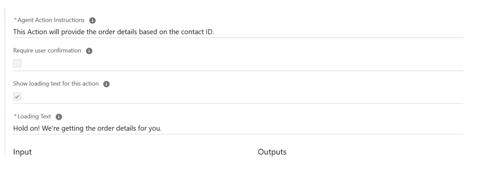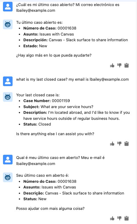 • Content from action execution that is triggered from user input stays in End User Language (English) through the entire session. The agent’s response that wraps around the action execution will be dynamic. For example, you might see a mixed-language response like “Asunto: Issues with Canvas.”