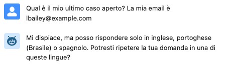 Essentially, the agent respects the languages it’s configured to understand. If you ask a question in a language not defined for the agent, it may not provide an answer in that language. Instead, it will communicate its inability to respond in the user’s asked language. In this example, a user asks a question in Italian. The agent isn’t configured to use Italian, so it answers in Italian only long enough to note the languages it is set up to use.