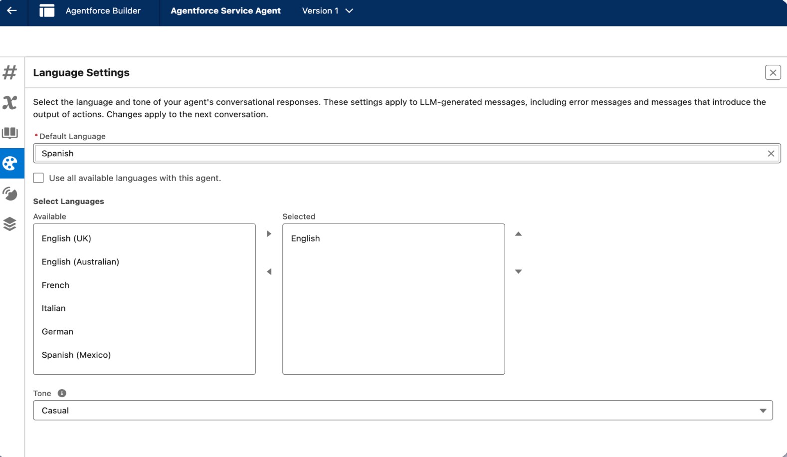 3. Agent Secondary Language: This is a set of supported languages the agent can switch to based on language detection. It’s also configured in Agentforce Builder under the “Language” tab under “Available” languages.