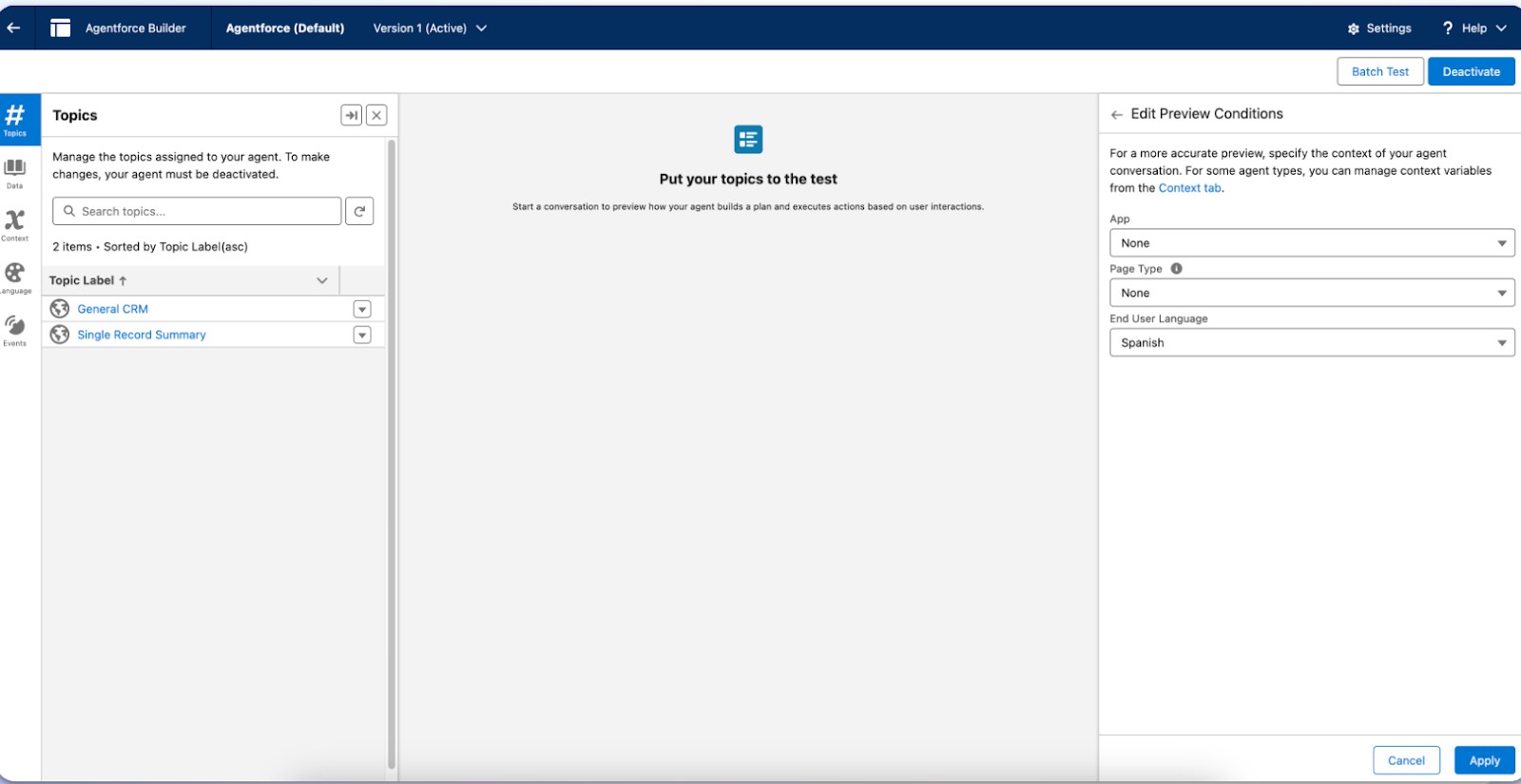 2. Agent Default Language: It’s configured in Agentforce Builder under the “Language” tab. This is the primary or fallback language for the agent. It’s used if no language is detected at the start of a session or if the detected language isn’t supported.