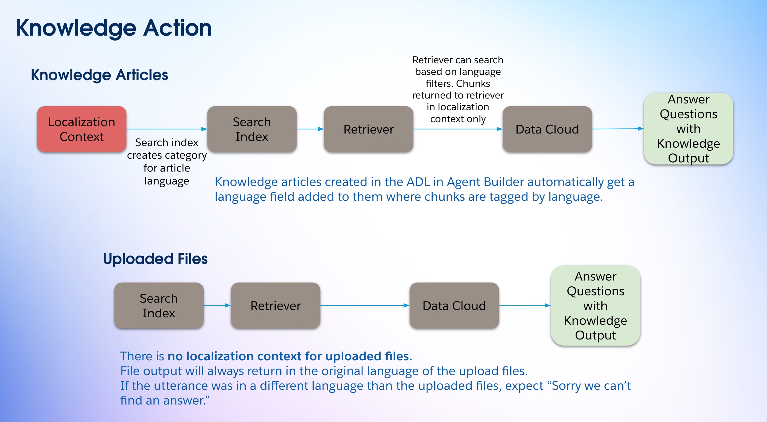 2. Salesforce knowledge articles include a language field that allows users to specify the article’s language. The retriever searches based on language filters in the language context. The retriever filters out articles if the language context doesn’t match the Knowledge Article Language.