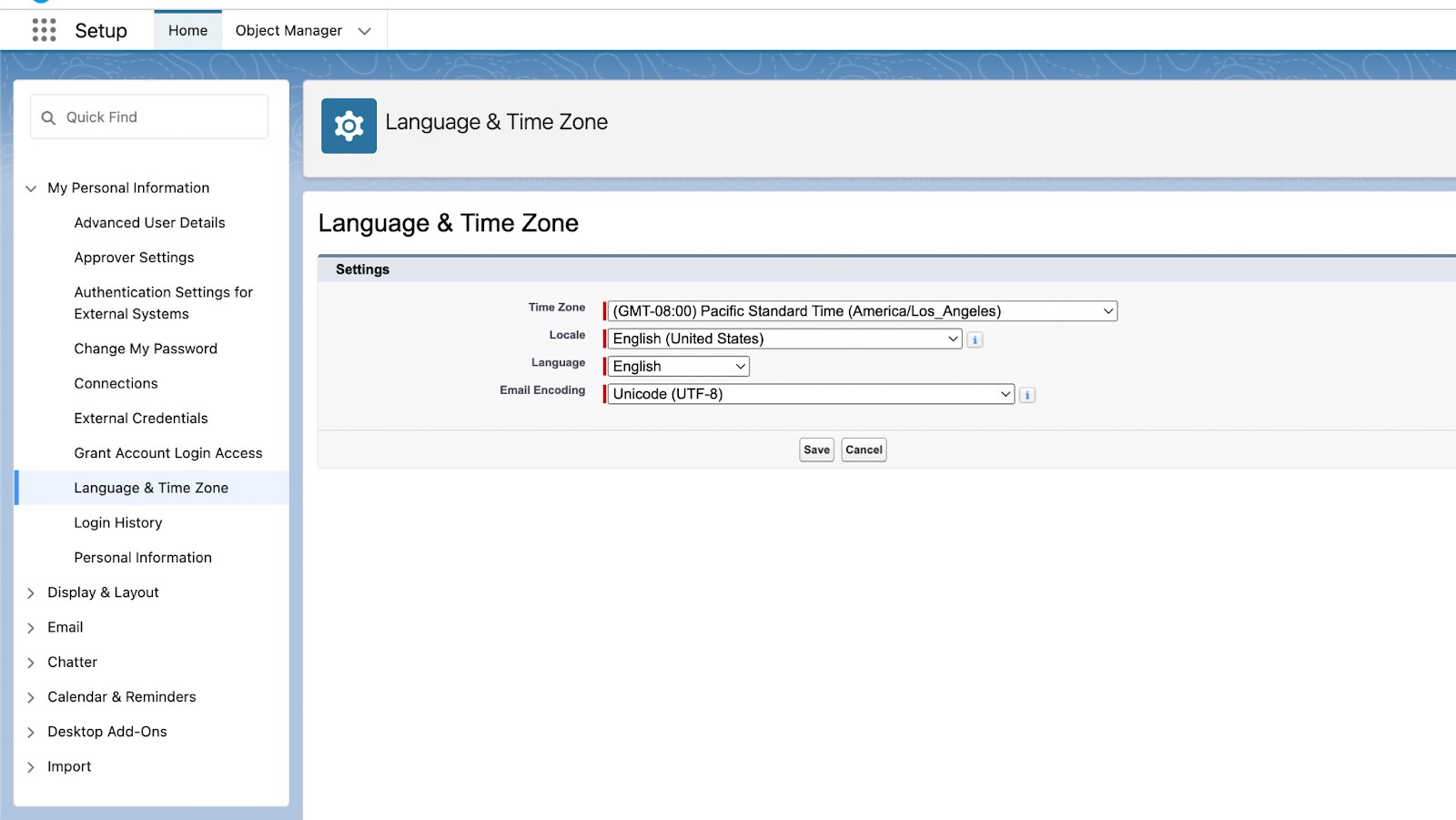 • i. To access the Salesforce user’s language settings, go to Profile → Settings → Language & Time Zone → Language.