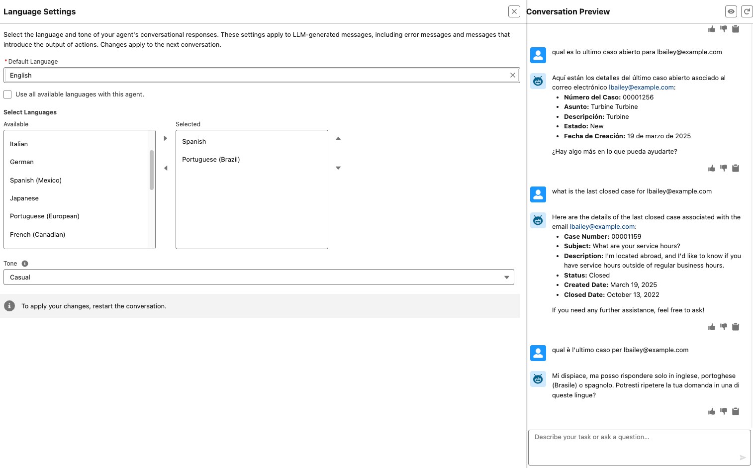 Note: You may see different behavior between agents. For example, some users noted that Agentforce Service Agent will specify the languages an agent can respond in, while Agentforce (Default) will often respond in the detected language.