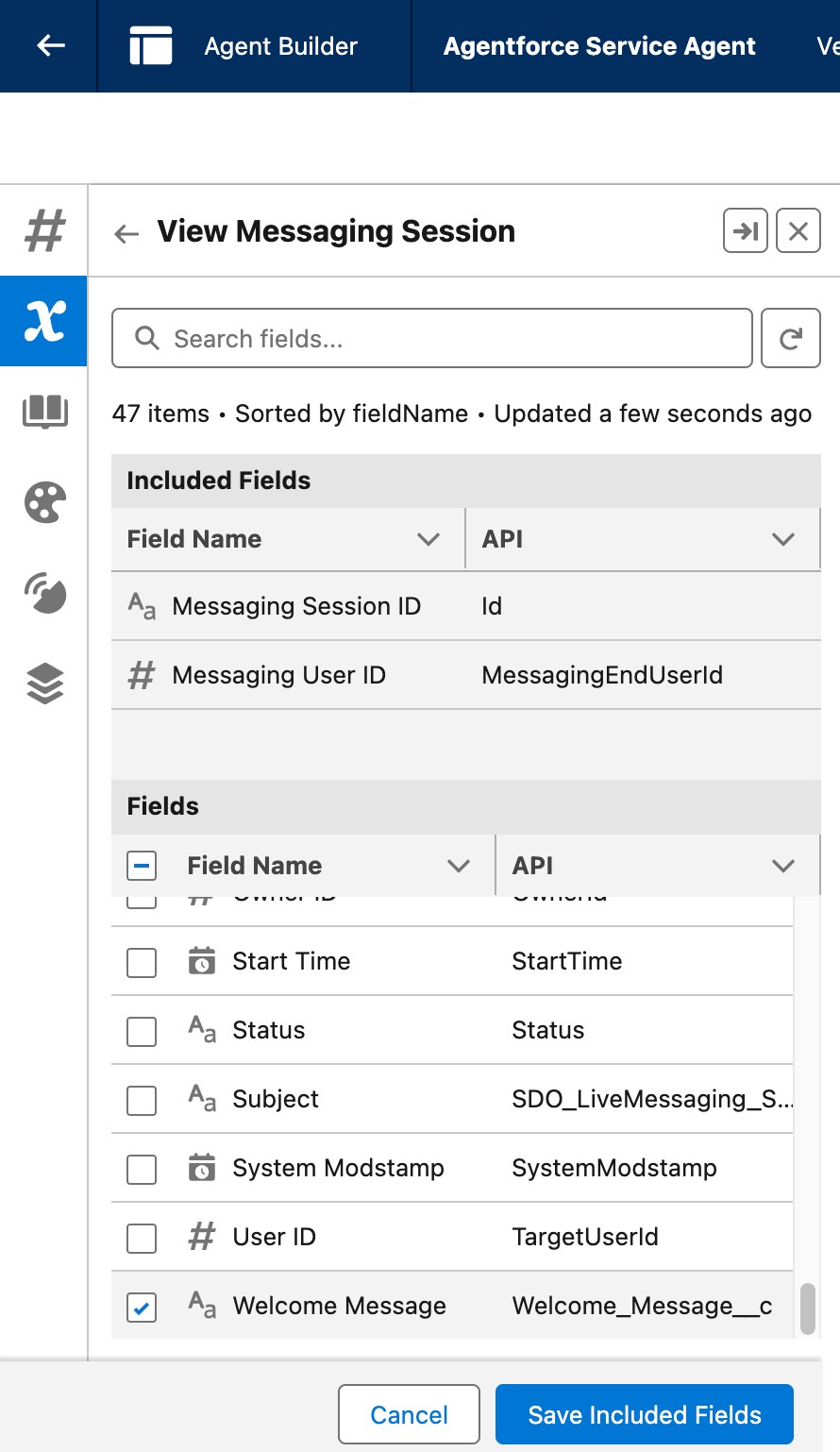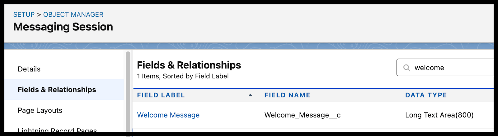 • Add a custom Long Text Area field to Messaging Session, which will store the dynamic Welcome Message