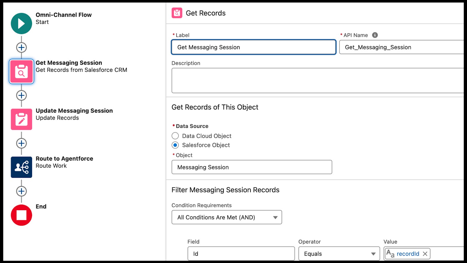 • b. Add or Edit the Get Messaging Session flow step. This step will retrieve the Messaging Session Record.