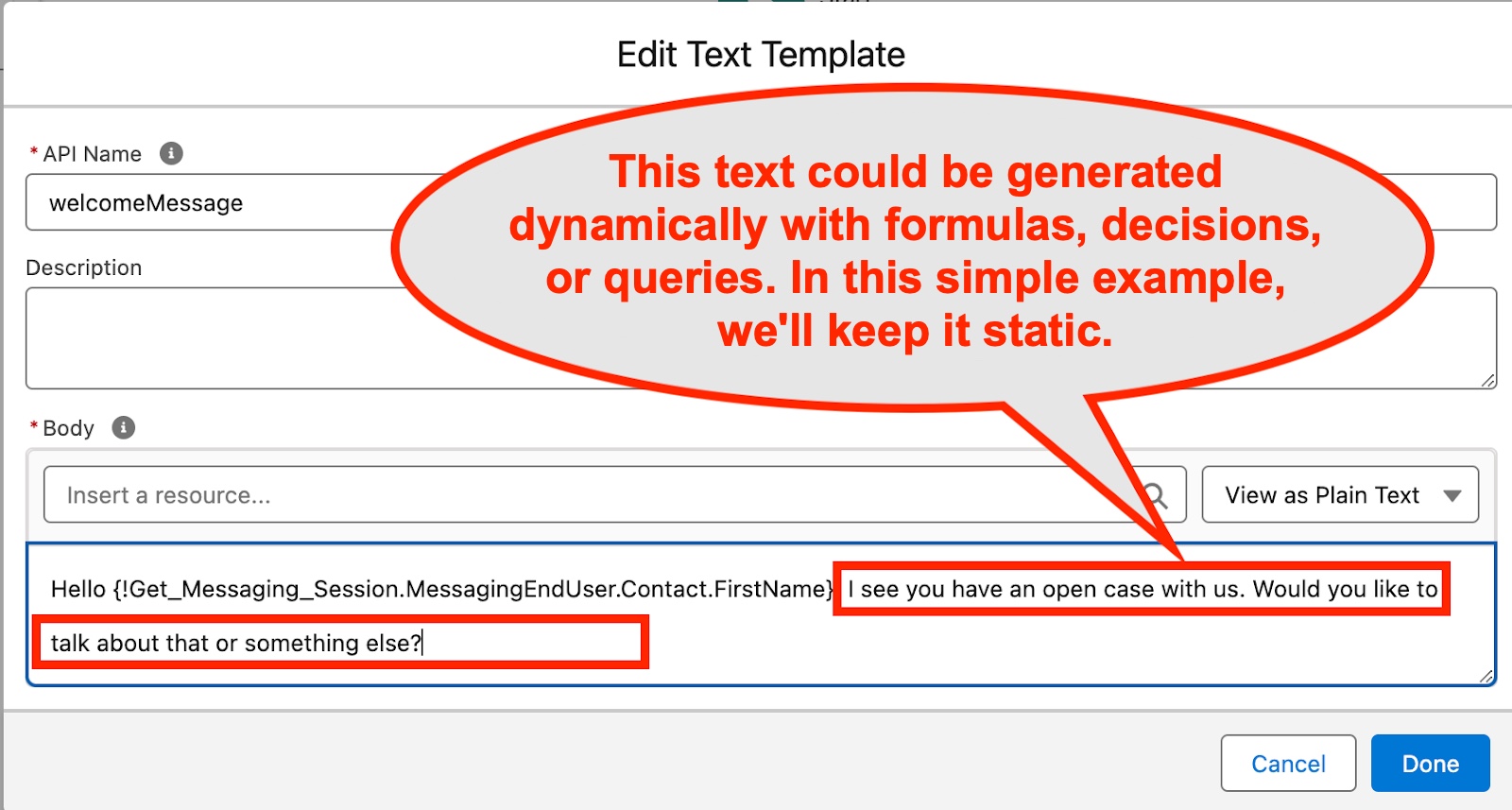 • c. Next, create a flow variable called “Text Template”, which will store the dynamically generated Welcome Message.