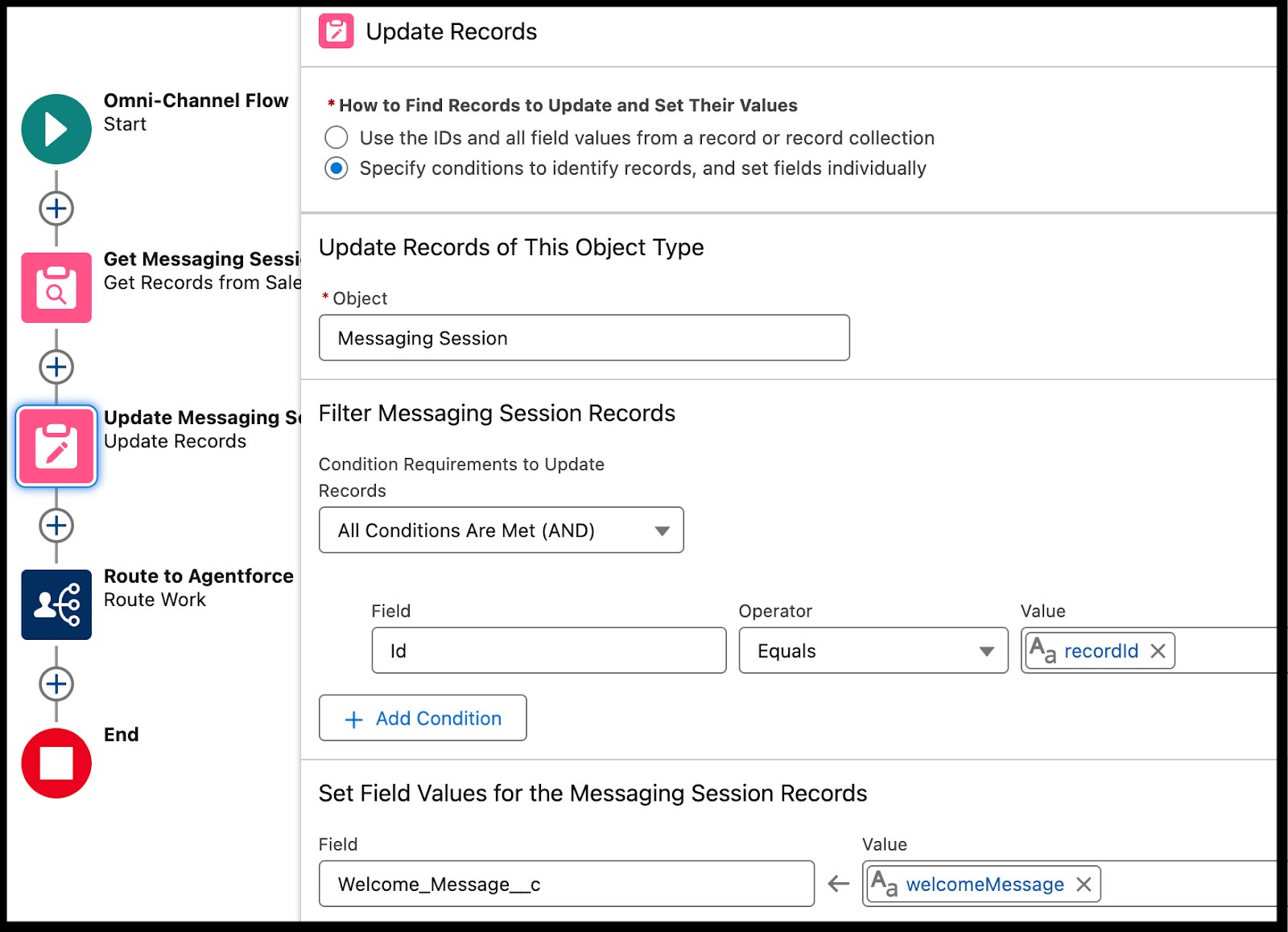 We’ll use the Omni-Channel routing flow to populate a generated welcome message in the Messaging Session record.