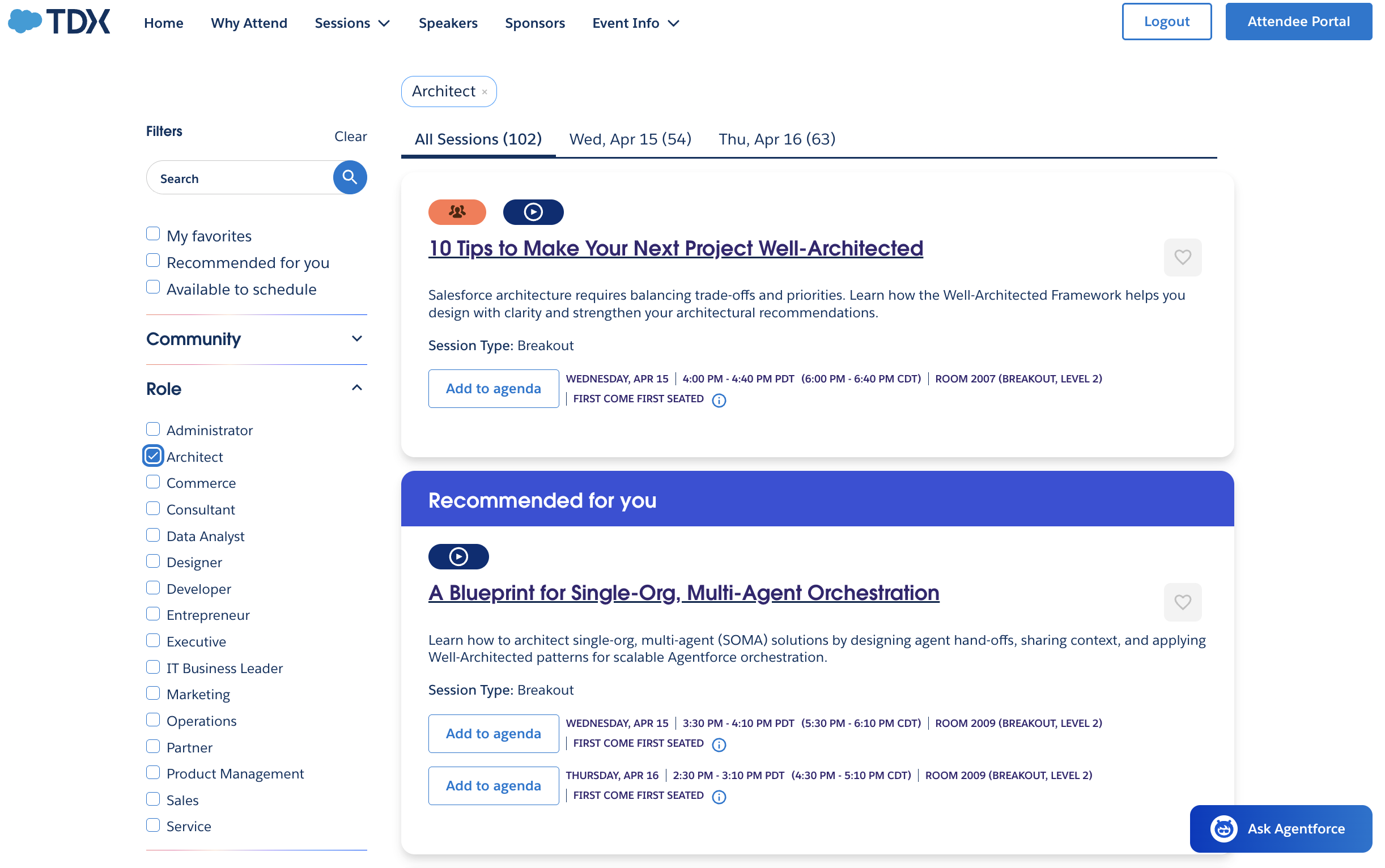 This guide will help you plan your architect experience and make the most of your time at TDX. Whether you’re attending in person or joining on Salesforce+, use these recommendations to plan your agenda on Agenda Builder.
