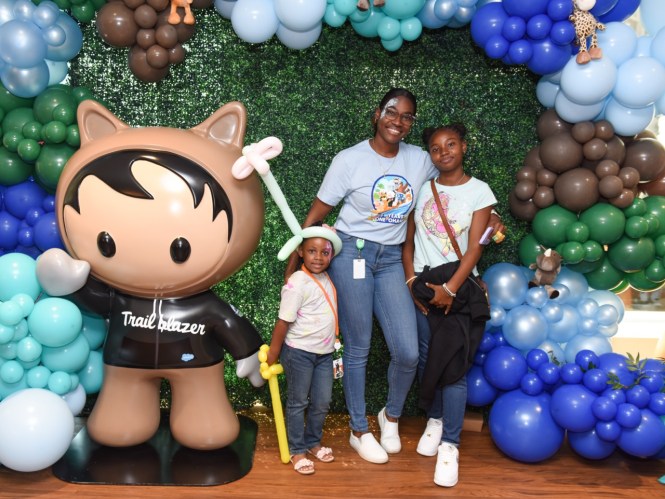 A woman and two younger children stand in front of a multi-colored balloon arch, next to a large statue of Salesforce's Astro character.