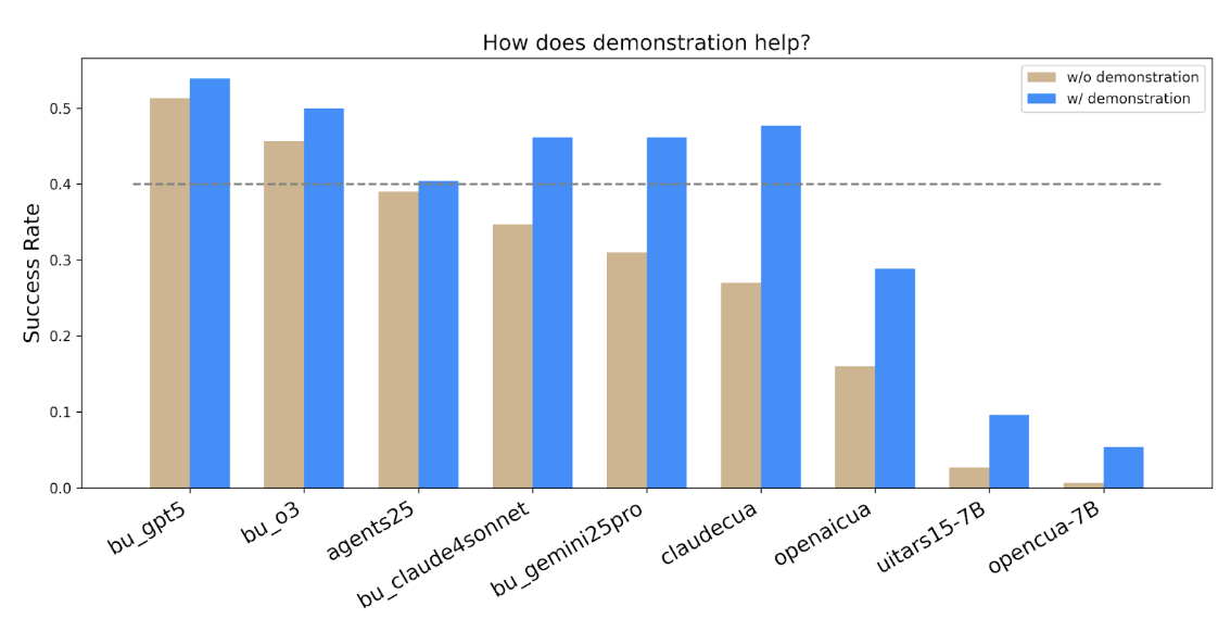 - Human demonstrations (showing the agent how to do a similar task) improved performance across most agents: higher success rates, lower time, lower token usage (please see the technical report for more details). But, some agents did not benefit as much.