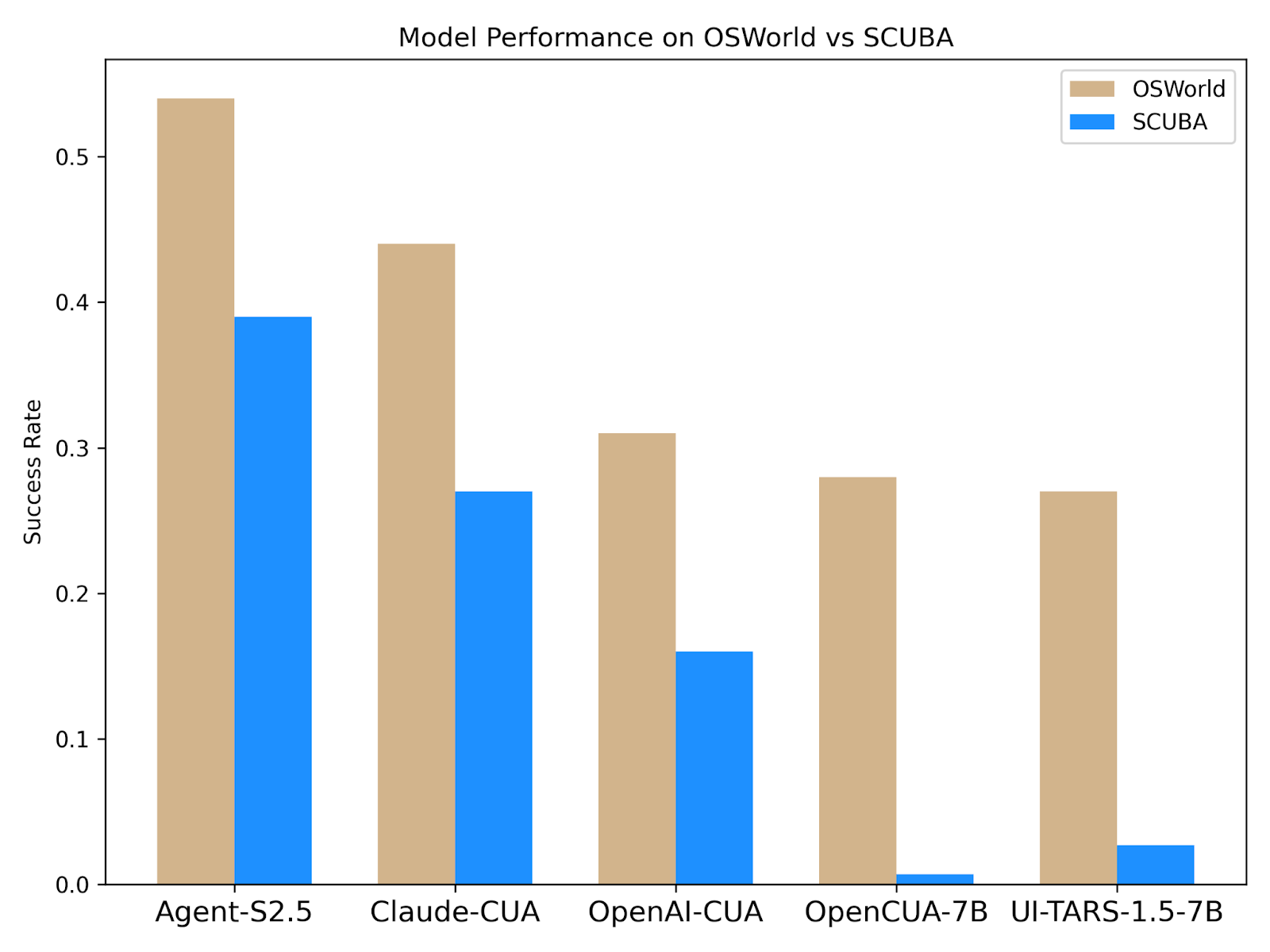 The performance drop when moving from the more generic OSWorld benchmark (which covers desktop applications) to SCUBA (CRM, enterprise workflows) is significant. The experiment shows a chart of drop in success rates when shifting the benchmark.