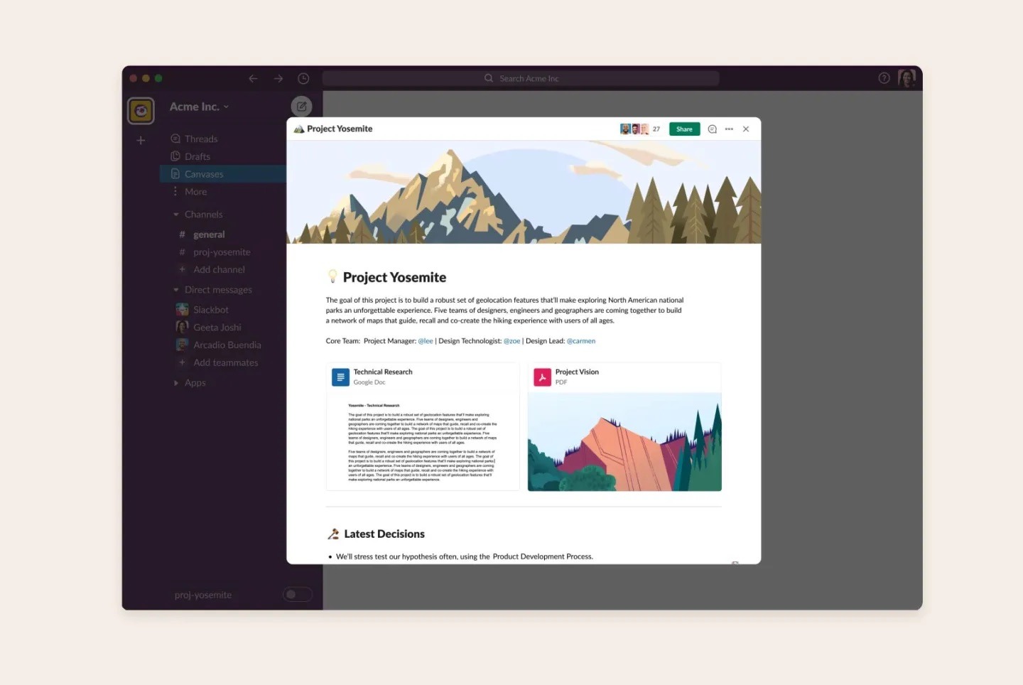 Canvases, Slack’s virtual whiteboards, are available in each channel, acting as a home for all the core information related to the project or team involved. Instead of forcing new hires or project members to scroll through weeks of history to find answers, you can share a fixed Canvas at the top of the channel with them (forever), and they can always come back on their own time.
