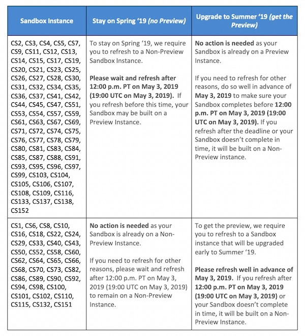Please read carefully and follow the instructions in the next section for specific information on how to handle each of your Sandboxes. In most cases, you will not need to do anything because your Sandbox is already on a preview instance. But you may need to take action before May 3, 2019 in order for your Sandbox to take part in the Summer ‘19 Preview.