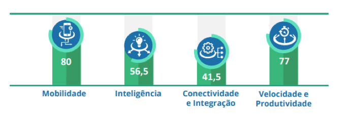 No que diz respeito aos pilares que compuseram o estudo, Mobilidade chegou a 80, seguido por Velocidade e Produtividade (77), Inteligência (56,5) e Conectividade e Integração (41,5).