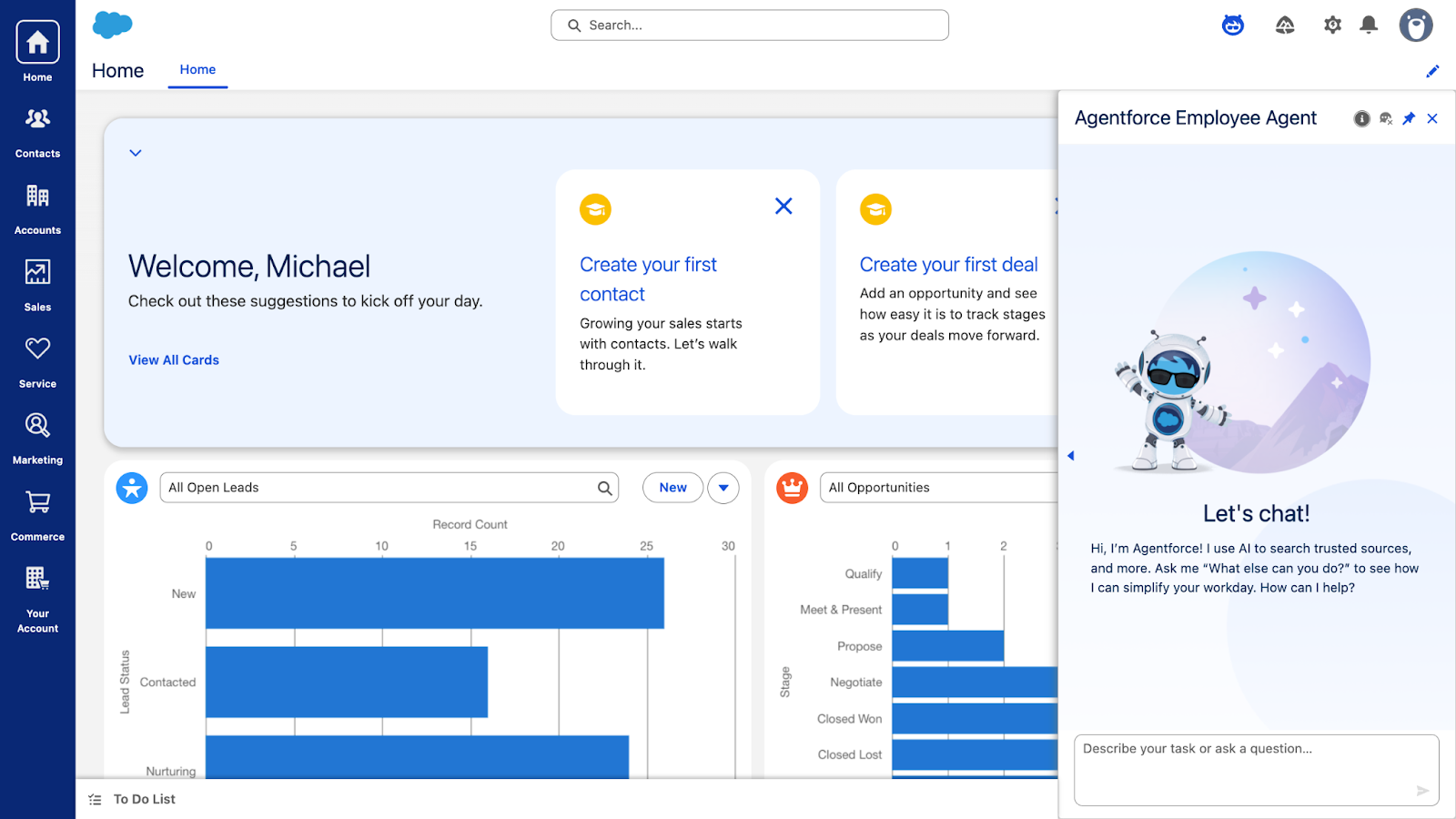 O agente para colaboradores funciona como um assistente de IA capaz de lidar rapidamente com tarefas como localizar e resumir detalhes de contas para a preparação de reuniões, lançar atividades (como anotações de chamadas) nos registros e criar e-mails contextualizados, liberando sua equipe para focar no relacionamento com os clientes e nas vendas em vez do trabalho administrativo.