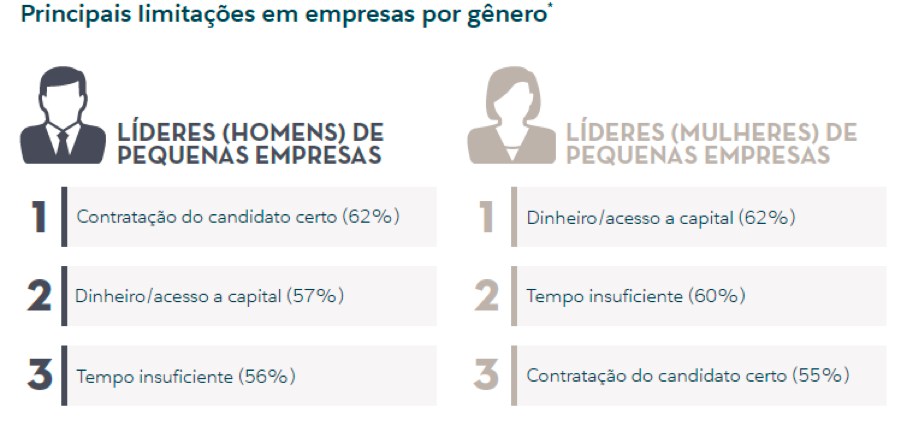 Os dados mostram que as mulheres ainda têm mais dificuldade para levantar fundos de capital de risco em comparação com os homens: 62% das mulheres relatam que o acesso a financiamento é um dos maiores obstáculos que enfrentam (em comparação com 57% dos homens). Mulheres líderes de pequenas e médias empresas indicam que o acesso a capital é seu maior desafio, e homens líderes dizem que seu maior desafio é a contratação do talento certo.