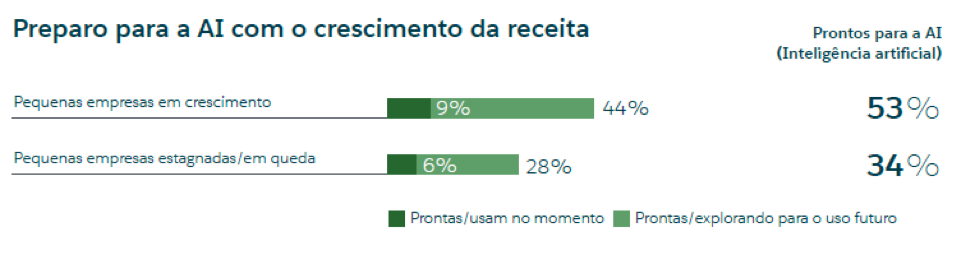 O que as pequenas empresas acham da inteligência artificial (IA)? Nossa pesquisa indica que a IA se tornou uma vantagem competitiva para as empresas em crescimento em 2019. Quase metade (46%) dos proprietários de pequenas e médias empresas entrevistados acredita que suas empresas estão prontas para usar IA. Talvez o sentimento positivo indique que essas pequenas empresas veem os benefícios desta tecnologia e se sintam menos intimidadas por esta crescente tendência em software.