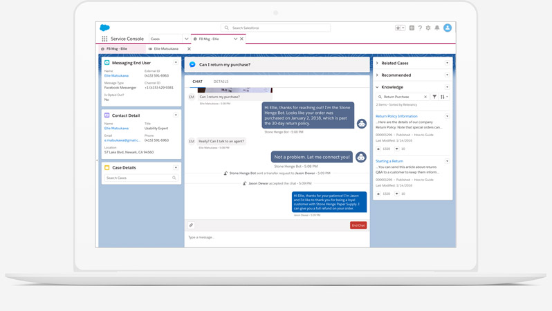 Evite que os clientes deixem seu site ou aplicativo, oferecendo várias opções de atendimento personalizado. Incorpore facilmente bate-papo ao vivo, artigos da base de conhecimento, gerenciamento de casos e muito mais com os Snap-ins do Service Cloud.