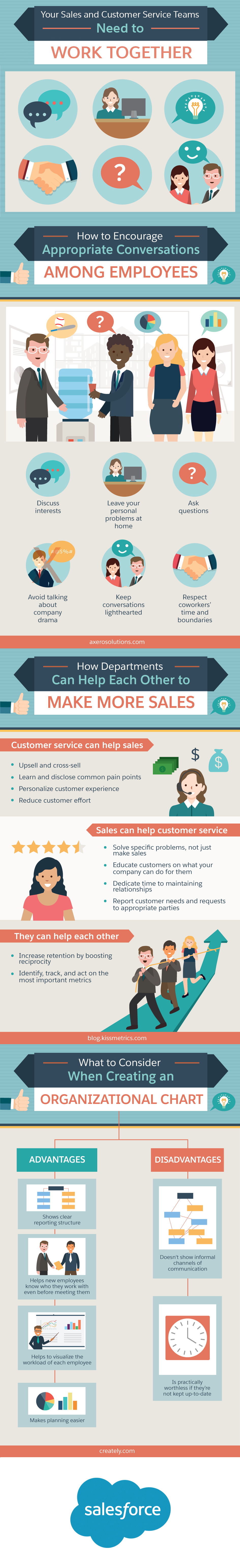Your sales and customer service departments need to work together to keep customers happy. For instance, a salesperson can tell a CSR about a new customer and give them tips on how to serve that client most effectively. In return, CSRs can keep salespeople aware of what aspects of the product or service are most helpful to customers and used most often, or inform sales reps about why customers break their commitments early or fail to renew their contracts when they expire.
