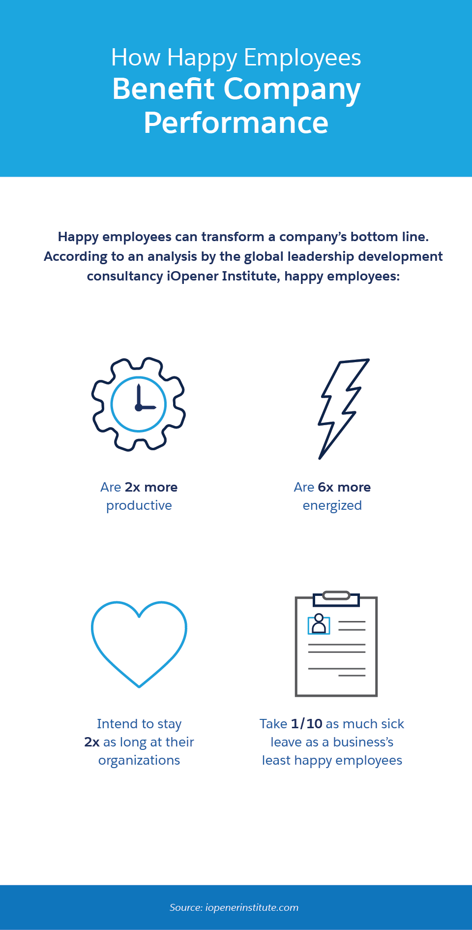 Happy employees aren’t just easier and more pleasant to work with, but they can also transform a company’s bottom line. According to an analysis by the global leadership development consultancy iOpener Institute, happy employees: