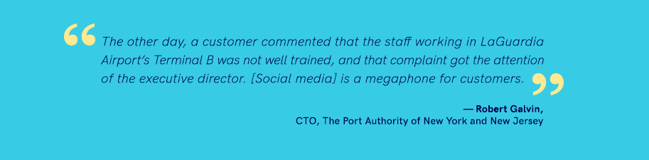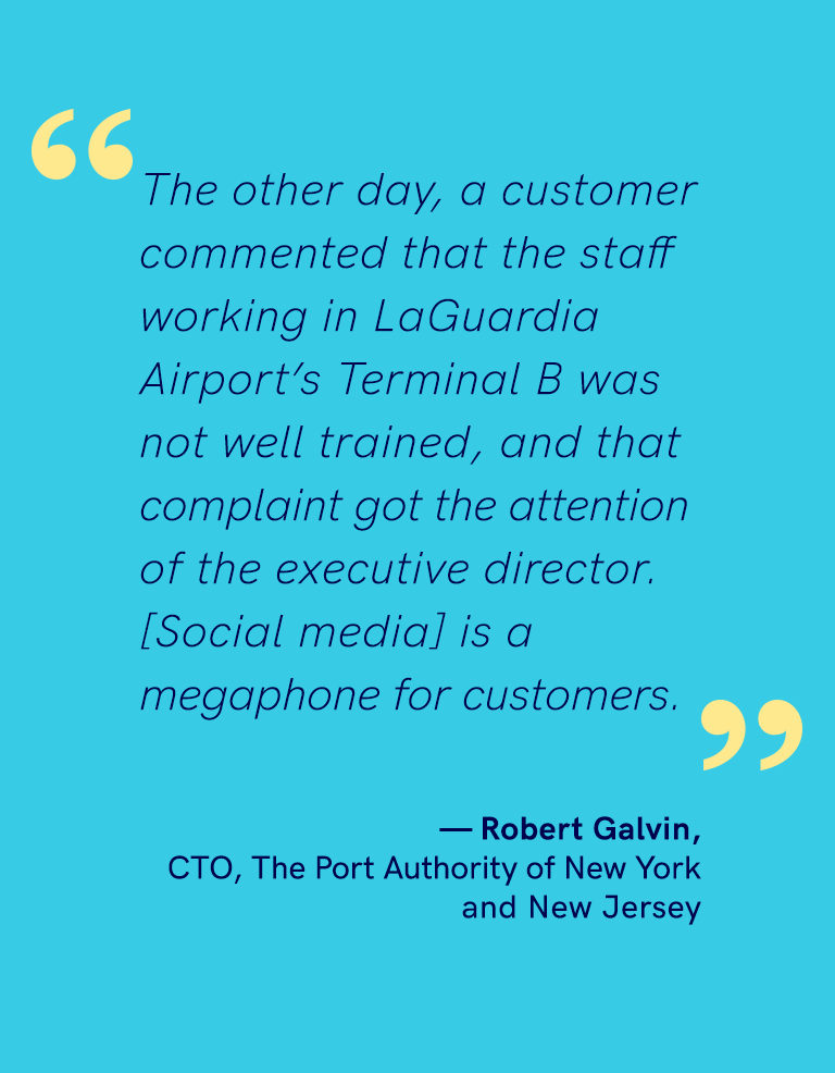“The other day, a customer commented that the staff working in LaGuardia Airport’s Terminal B was not well trained, and that complaint got the attention of the executive director,” Galvin says. “[Social media] is a megaphone for customers.”