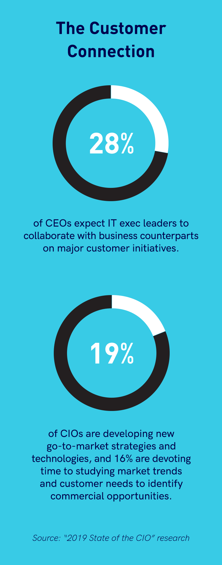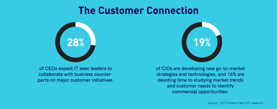 Getting closer to customers is also a CEO mandate—28% of the CEOs who participated in the “2019 State of the CIO” research expect their IT exec leaders to collaborate with their business counterparts on major customer initiatives. In addition, strategic CIOs are spending more time on customer-centric activities—19% are currently developing new go-to-market strategies and technologies, and 16% are devoting time to studying market trends and customer needs to identify commercial opportunities, the 2019 research found.