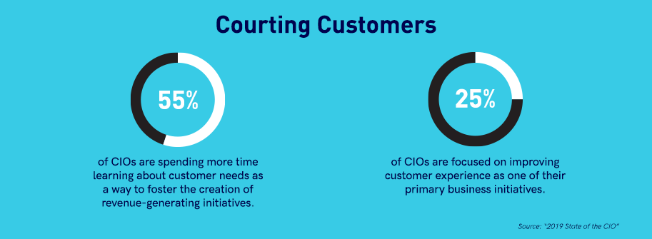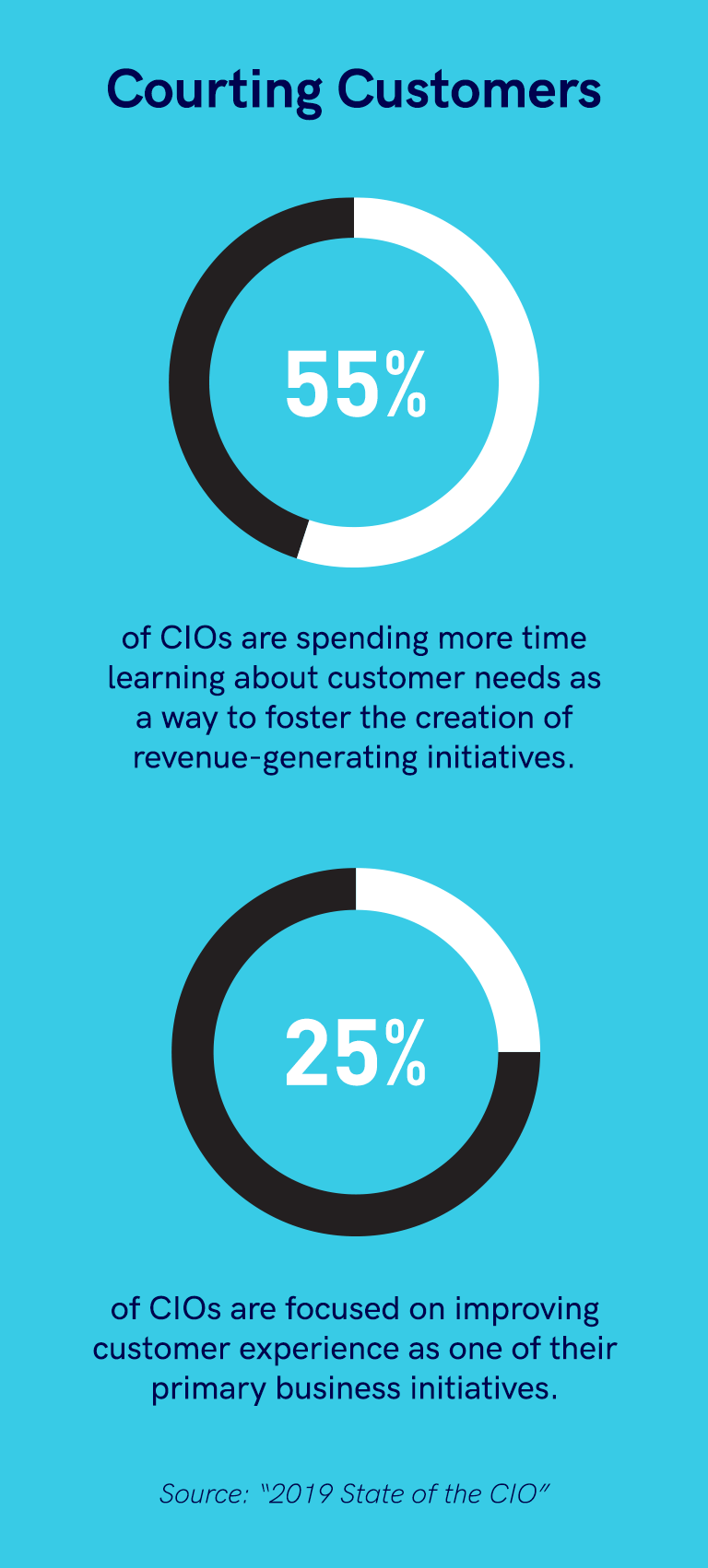 According to “2019 State of the CIO” research, 55% of CIOs are spending more time learning about customer needs as a way to foster the creation of revenue-generating initiatives. At the same time, a quarter of the CIOs responding to the survey are prioritizing improvements to customer experience as one of their primary business objectives.