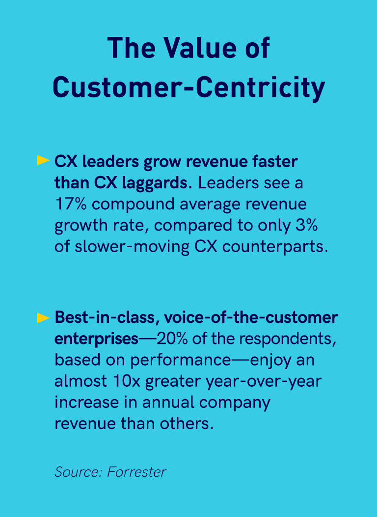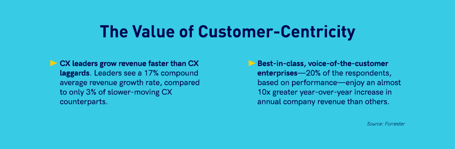 Why is customer-centricity so important today? The easy answer is that companies simply perform better when they put customer needs and experience at the epicenter of their business agenda. Take growth, for example. A Forrester study found that customer experience (CX) leaders outperformed their counterparts in revenue growth. Those companies with a customer-centric charter enjoyed a 17% compound average revenue growth rate (CAGR), compared to only 3% for those shops that were slower to steer toward a CX focus.
