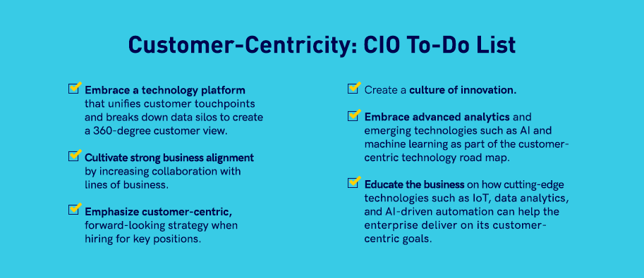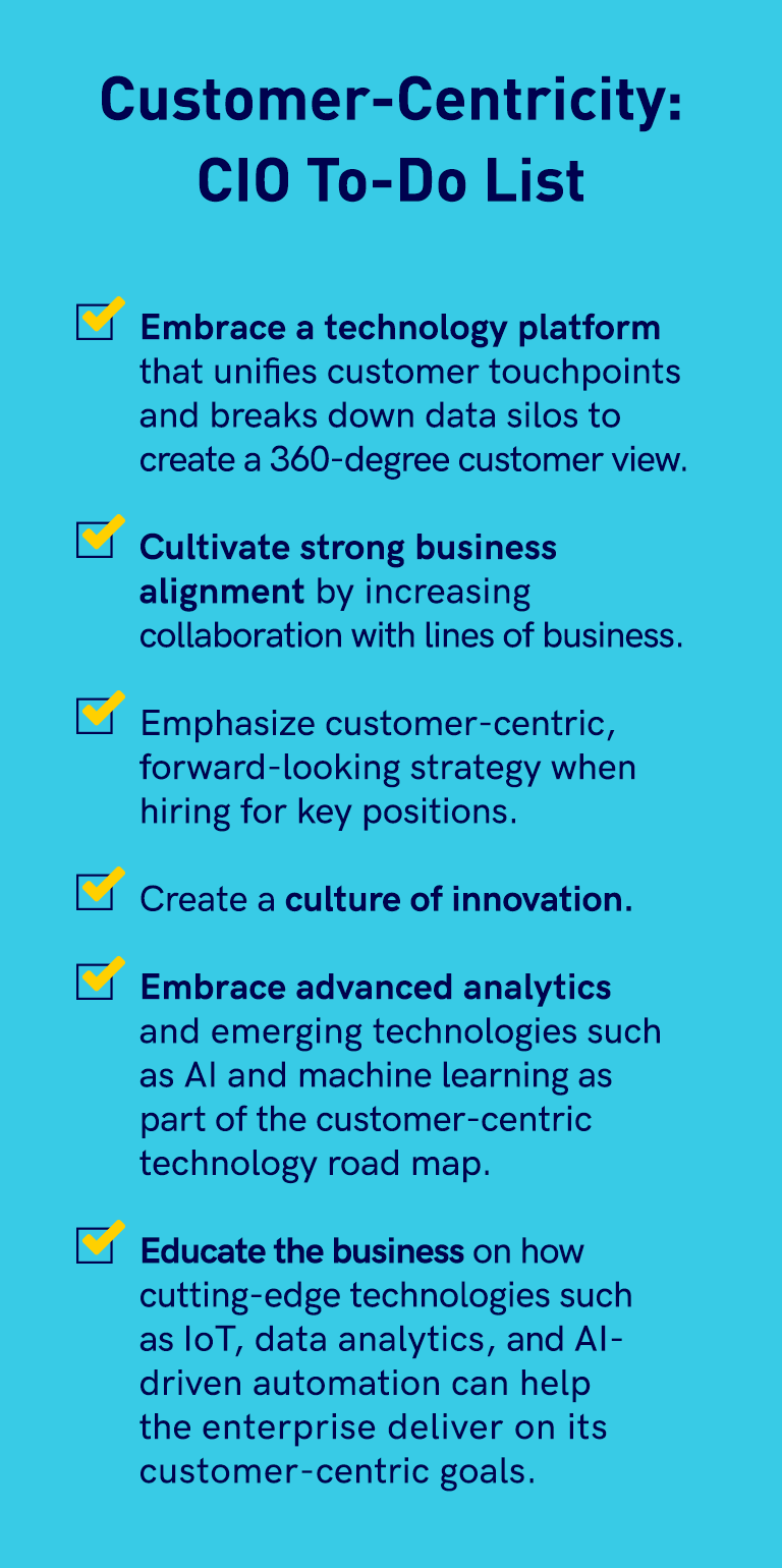 Customer-centric CIOs are also actively deploying state-of-the-art technologies such as artificial intelligence (AI) and advanced analytics. These innovations enable a deeper dive into critical insights that can help unleash new products and revenue streams and create more-productive interactions. These technologies also enable new levels of proactive and preventive service designed to keep customers content and engaged over a longer lifecycle.