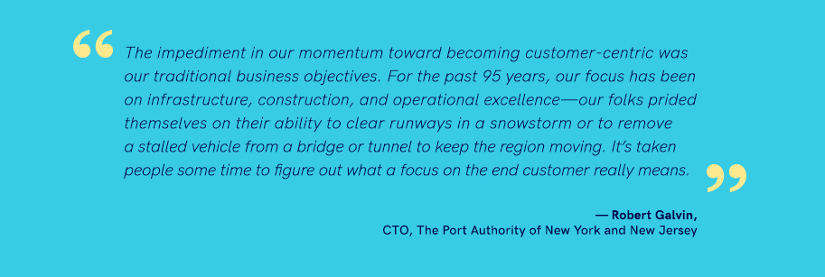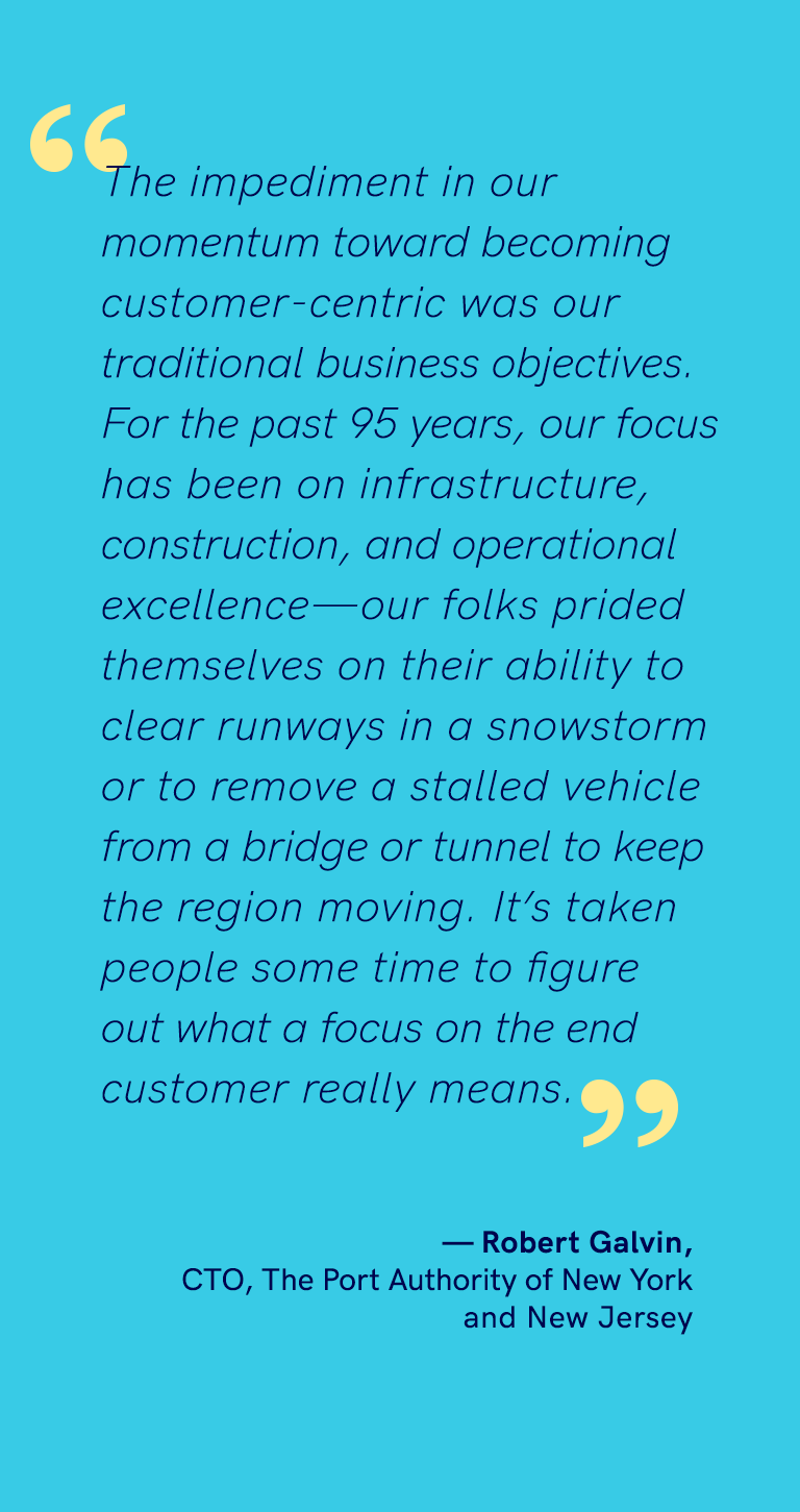 “The impediment in our momentum toward becoming customer-centric was our traditional business objectives,” Galvin says. “For the past 95 years, our focus has been on infrastructure, construction, and operational excellence—our folks prided themselves on their ability to clear runways in a snowstorm or to remove a stalled vehicle from a bridge or tunnel to keep the region moving. It’s taken people some time to figure out what a focus on the end customer really means.”