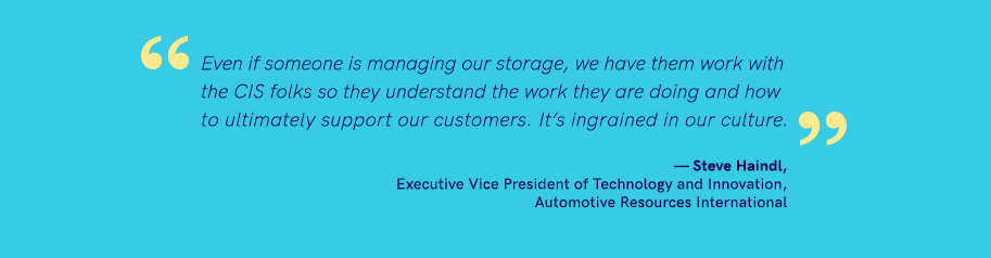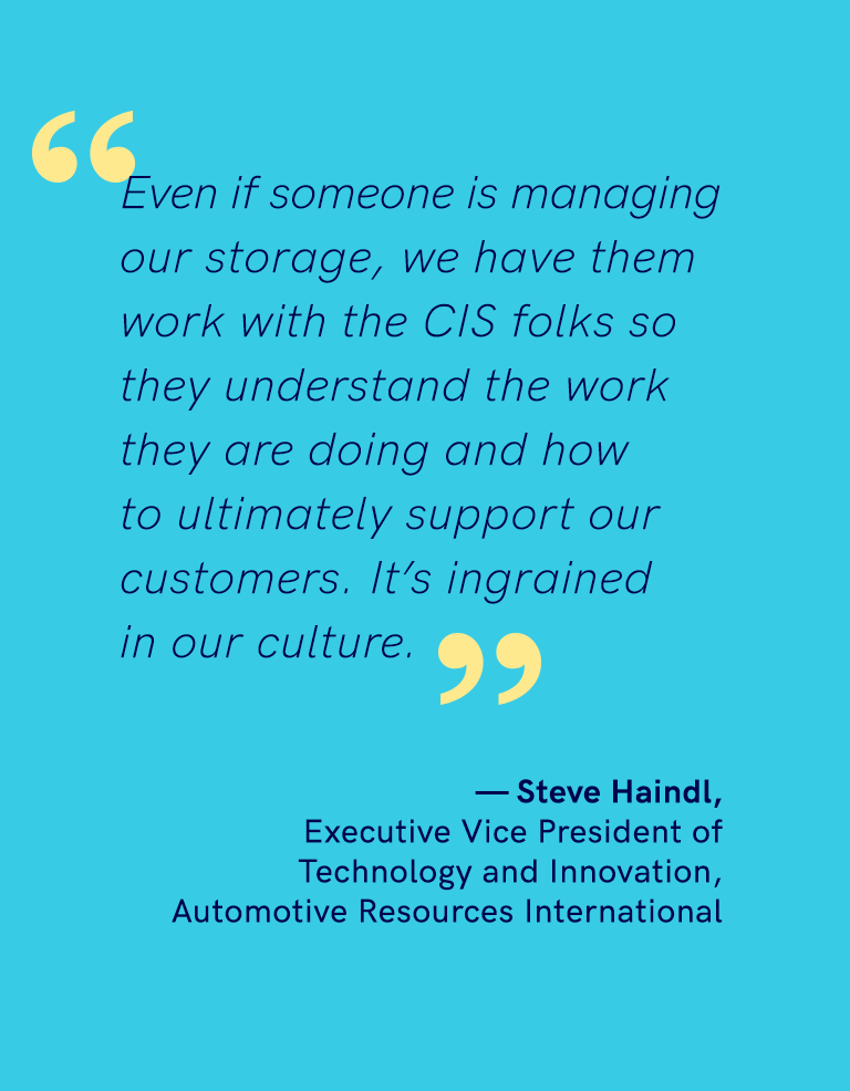 “Even if someone is managing our storage, we have them work with the CIS folks so they understand the work they are doing and how to ultimately support our customers,” says Steve Haindl, executive vice president of technology and innovation at Automotive Resources International. “It’s ingrained in our culture.”