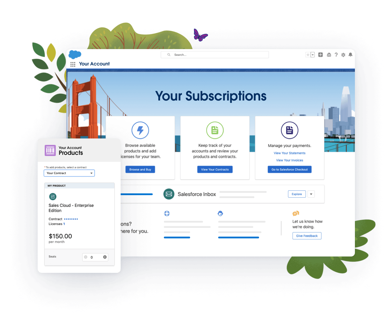 Discover new products and add-ons, manage your Salesforce subscriptions, and contact support for account-related questions.