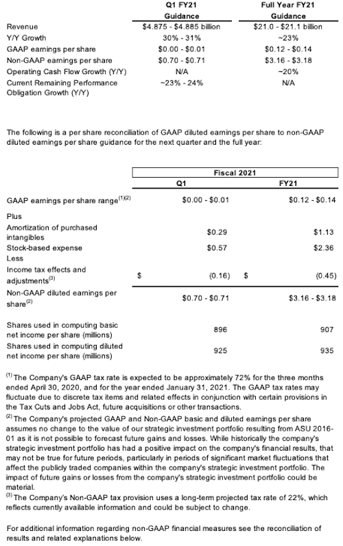 As of February 25, 2020, the company is initiating its GAAP earnings per share guidance, non-GAAP earnings per share guidance, and operating cash flow guidance for the full fiscal year 2021. The company is initiating its GAAP earnings per share guidance, non-GAAP earnings per share guidance, and current remaining performance obligation guidance for its first quarter of fiscal year 2021. The company is raising its revenue guidance previously provided on December 3, 2019 for its first quarter and full fiscal year 2021.