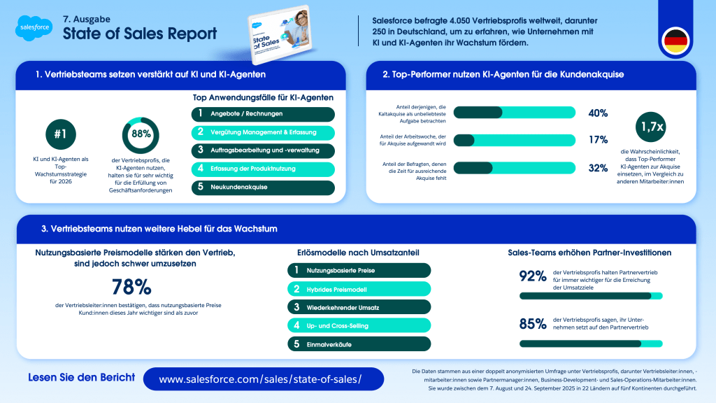 München, 4. Februar 2026 – Der neue State of Sales Report von Salesforce zeigt: Vertriebsteams in Deutschland setzen 2026 verstärkt auf KI und KI-Agenten, um ihre Ziele zu erreichen. Denn sie sehen sich steigenden Kundenerwartungen gegenüber, die sie mit begrenzten Kapazitäten erfüllen müssen. Die größte Produktivitätsbremse stellen aufwändige administrative Abläufe dar. KI und KI-Agenten sollen dabei helfen, diese Engpässe aufzulösen: So bestätigen 88 Prozent der deutschen Vertriebsleiter:innen, die bereits KI-Agenten einsetzen, dass diese entscheidend seien, um ihre Arbeit besser zu erledigen. Durch die Produktivitätssteigerung gewinnen Vertriebsteams Freiräume, um Kundenbeziehungen auszubauen und das Wachstum zu fördern.