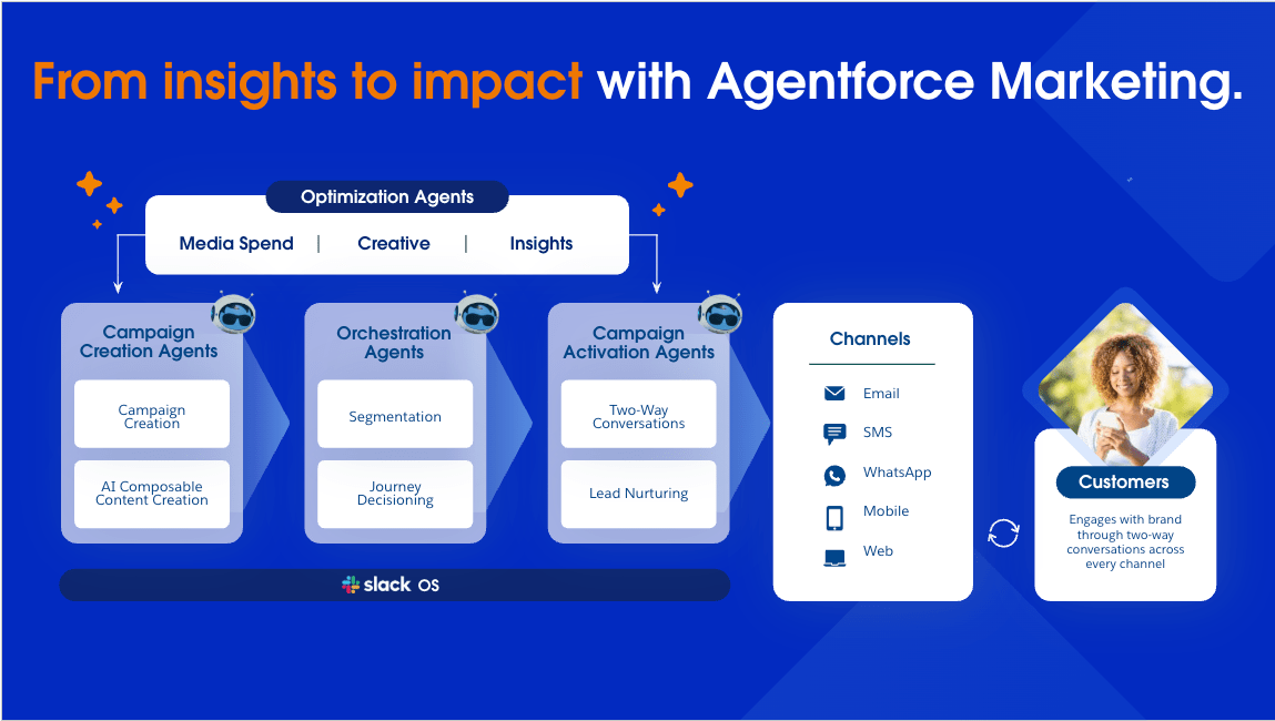 Más del 50% de los presupuestos se desperdicia por segmentación deficiente o análisis tardío. Agentforce Marketing cambia esto mediante agentes de optimización que aprenden en tiempo real, supervisando campañas, inversión y creatividades.