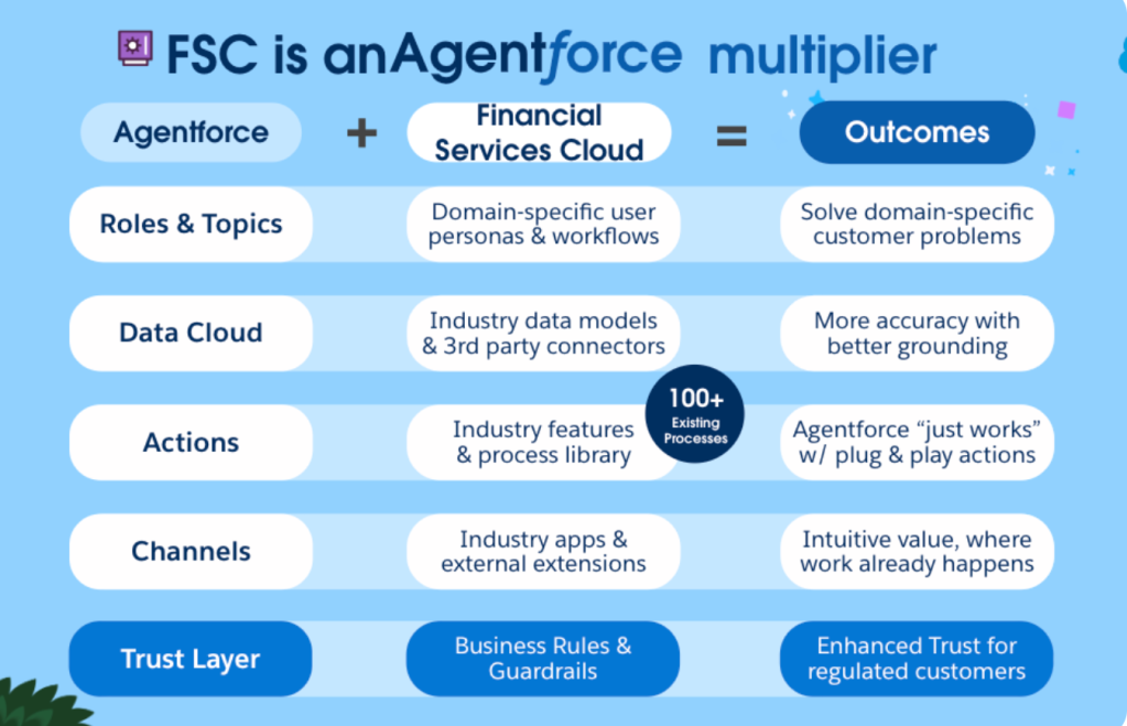 Firmas de wealth management pueden usar agentes IA como Agentforce junto con aplicaciones especializadas, como Financial Services Cloud, para automatizar operaciones, atención al cliente, incorporación de clientes, cumplimiento normativo y comunicación personalizada.