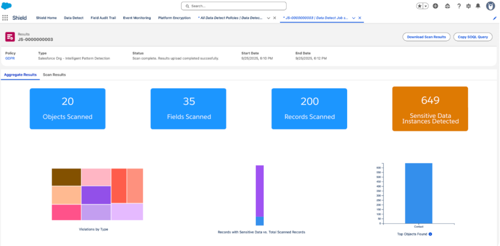 Además, los escaneos a nivel de objeto mejoran la generación de informes y el análisis, al ofrecer una visibilidad más precisa de los datos sensibles en áreas concretas de su entorno de Salesforce, lo que resulta especialmente valioso si su organización tiene estructuras de datos complejas y diversos requisitos de seguridad.