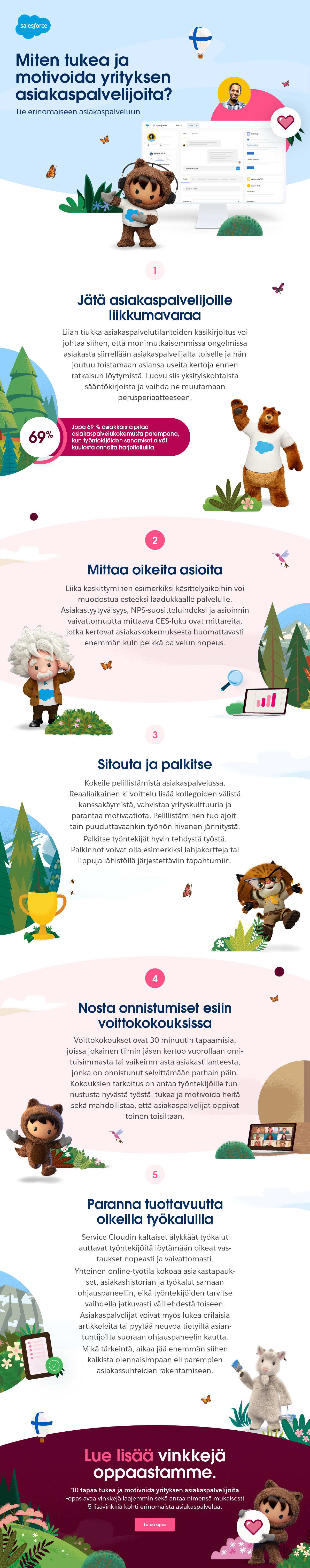 Miten yritykset voivat sitten tukea asiakaspalvelijoita ja pysäyttää työntekijöiden vaihtuvuuden kierteen? Tässä blogissa esittelemme viisi keinoa. Loput viisi vinkkiä voit lukea oppaastamme 10 tapaa tukea ja motivoida yrityksen asiakaspalvelijoita.