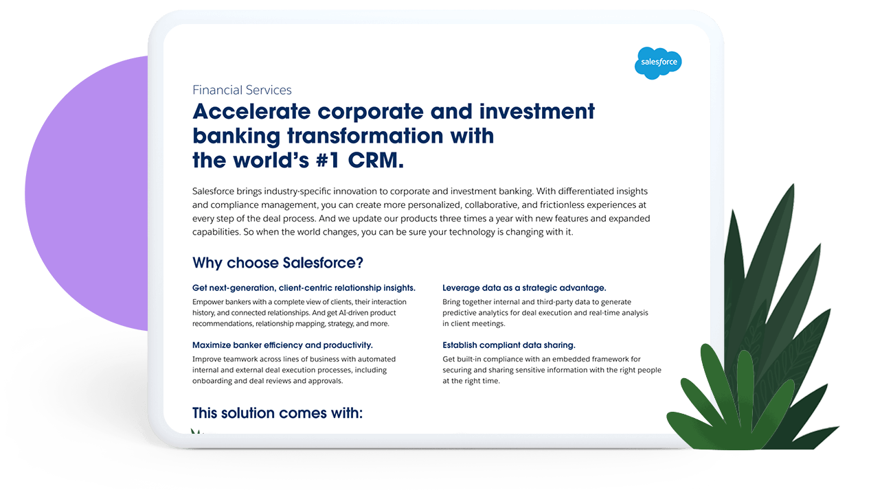 With purpose-built industry functionality and all the capabilities of Sales Cloud and Service Cloud, Financial Services Cloud helps fuel productivity and compliant collaboration through the entire lifecycle of a deal. Read the datasheet to learn how you can: