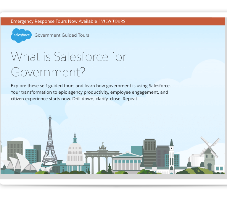 Explore these self-guided tours and learn how government is using Salesforce. Your transformation to epic agency productivity, employee engagement, and citizen experience starts now. Drill down, clarify, close. Repeat.