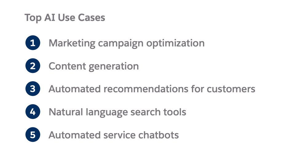 - Mise en place de votre vitrine digitale : l’IA vous aide à créer votre vitrine digitale en un rien de temps. Salesforce Commerce Cloud propose des modèles variés, des vitrines composables et des outils de merchandising pour simplifier vos opérations d’e-commerce.