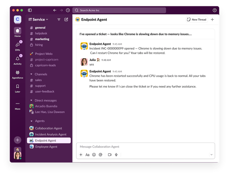Agentforce IT Service est accessible là où les employés travaillent déjà : Slack, Microsoft Teams, portail d’entreprise ou chat web. Un employé peut simplement formuler sa demande dans son interface de messagerie habituelle, et les agents IA s’occupent du reste : répondre aux questions, résoudre les problèmes ou faire remonter les demandes urgentes.