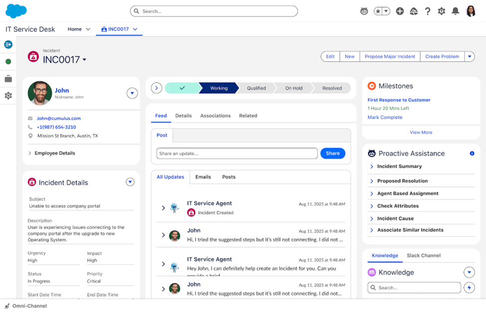 Capture d’écran : IT Service Desk repose sur Agentforce, des outils de productivité et une base de connaissances pour synthétiser, détecter et résoudre les problèmes.
