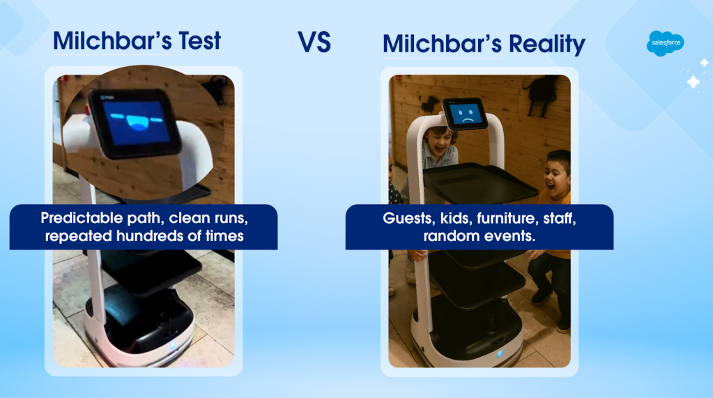 מילבר נטש מיד את העמדה שלו והתחיל להתגלגל בנחישות מאיימת ישר לכיוון דלת היציאה, כאילו הוא הגיש הרגע מכתב התפטרות והחליט לעזוב מוקדם. זה גרם לי לחשוב: האם הנהלת המלון בכלל יודעת שזה קורה? זה בדיוק ההבדל בין בדיקה מבוקרת במעבדה לבין פריסה בשטח. ה"נתיב השמח" הוא מה שאנחנו מתכננים על הנייר. החיים האמיתיים הם מה שקורה כשילד לוחץ על הכפתור הלא נכון, כשמסדרון חסום, או כשמישהו משתמש במערכת בדרך שאף אחד לא צפה מראש.