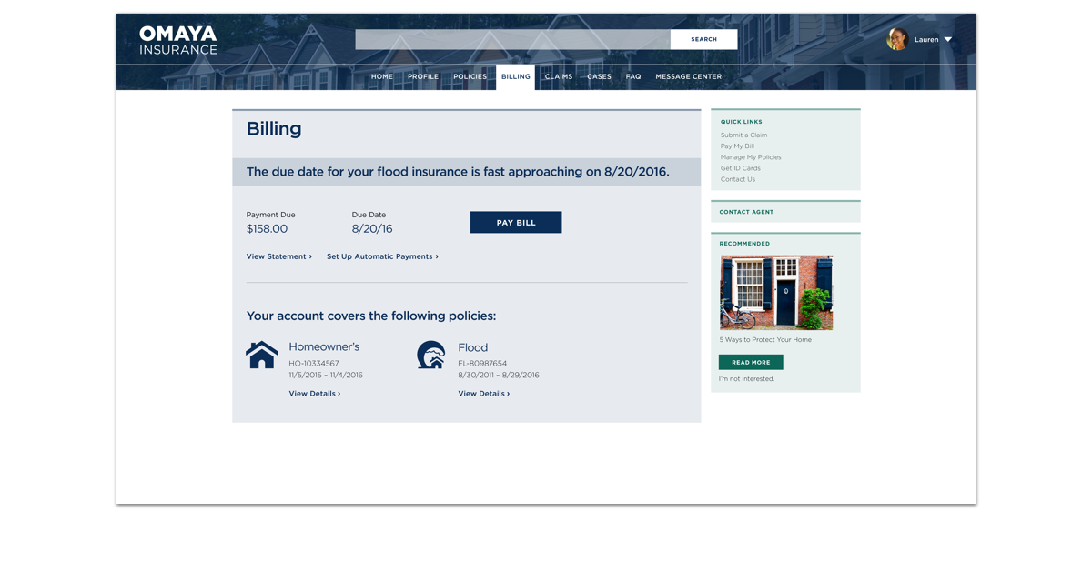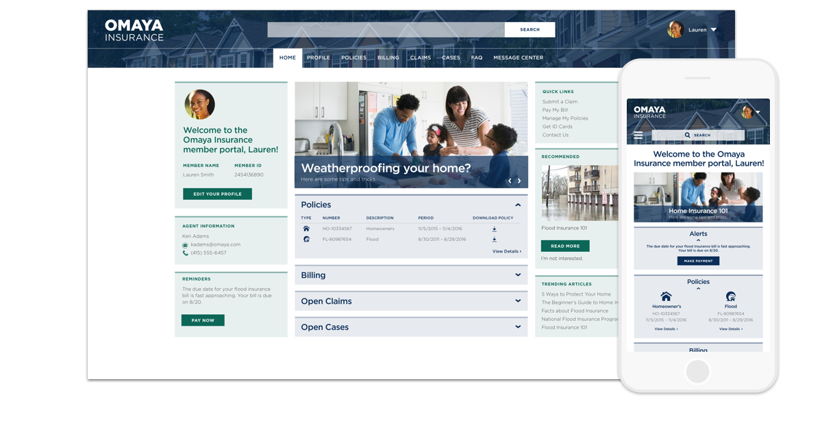 Customers have a single destination to quickly access all their important account details: profile information, active policies, open claims and cases, agent information, and billing reminders.