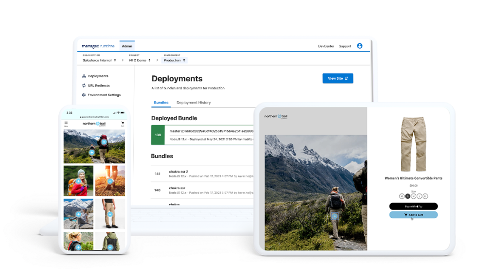 - Headless PWA Kit and Managed Runtime: With the new Progressive Web Application (PWA) Kit and Managed Runtime, developer teams can quickly and cost-efficiently decouple front-end and back-end technologies to create highly customized consumer-facing experiences — also known as headless commerce. Traditional commerce solutions take months to implement and are disconnected from the full customer journey. With Salesforce, developers can spend less time maintaining infrastructure and more time creating interactive and innovative customer experiences.