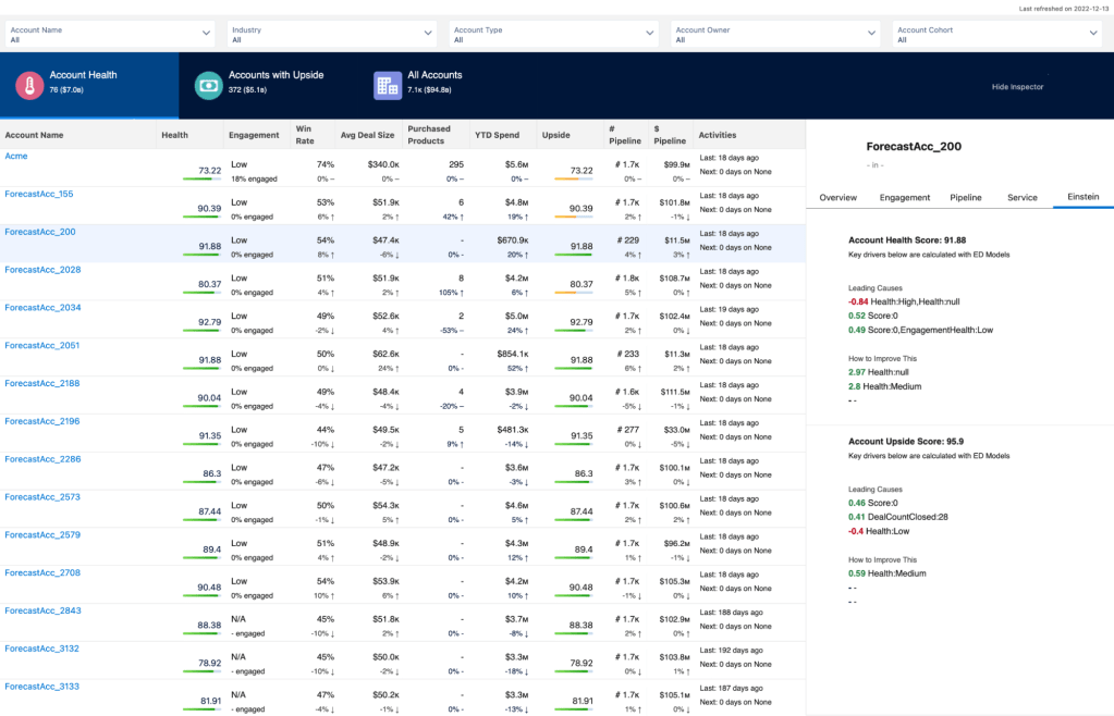 - Account Discovery — Account Discovery is a dashboard built on top of CRM Analytics and accessible directly from the account list view. It uses Einstein Discovery to provide out-of-the-box, configurable, AI-driven health and upside scores to help identify accounts at risk and accounts with upside.