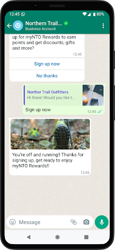 - Craft an end-to-end customer journey: Create, send, and manage connections with customers throughout their journey using WhatsApp and Journey Builder to create seamless customer experiences. For example, customers may receive a WhatsApp message with a reminder about an upcoming order arriving next week. As an extra incentive, the message could include a promotion with a 20% discount for a new or related product offering. The user could then confirm via a button whether to automatically add this new product to their next order.