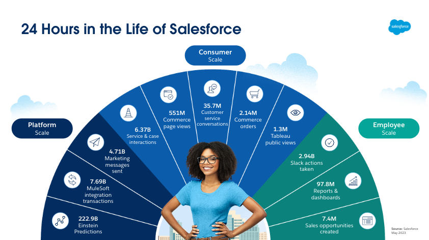 We power Platform at scale with 4.71 billion messages sent, Consumer at scale with 6.37 billion service and case interactions, and Employee at scale with more than 2.94 billion Slack actions taken — all in one day.