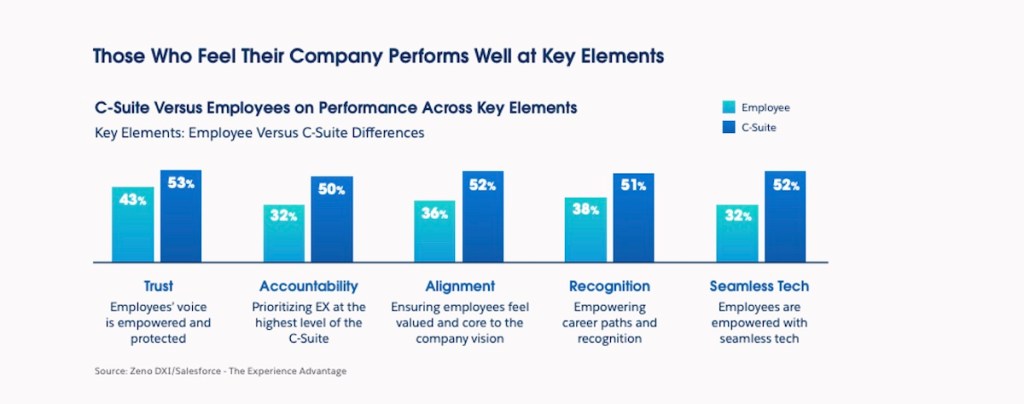 Quick Take: Salesforce’s new “The Experience Advantage” report reveals that a focus on improving employee experience (EX) can boost revenue growth (up to 50% or more). The report’s full findings, which are detailed in this article, also show a deep disconnect between C-suite perception and the experiences of their employees.